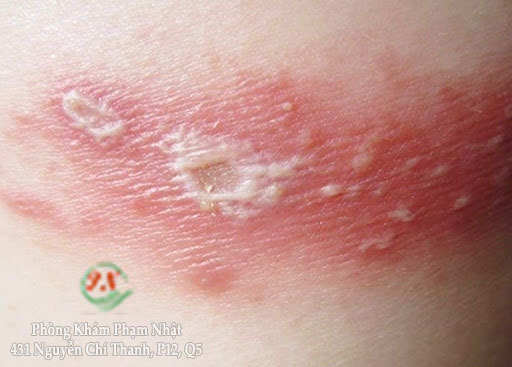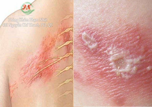• Triệu chứng da: vài ngày sau, trên những mảng đỏ da xuất hiện mụn nước, bọng nước tập trung thành đám giống như chùm nho, lúc đầu mụn nước căng, dịch trong, sau đục, hóa mủ, dần dần vỡ đóng vảy tiết. Thời gian trung bình từ khi phát tổn thương đến khi lành sẹo khoảng 2-4 tuần. Người cao tuổi tổn thương nhiều, diện rộng; mụn nước, bọng nước có thể xuất huyết, hoại tử da, nhiễm khuẩn, sẹo xấu và kéo dài. Ở trẻ em tổn thương ít, tiến triển nhanh.